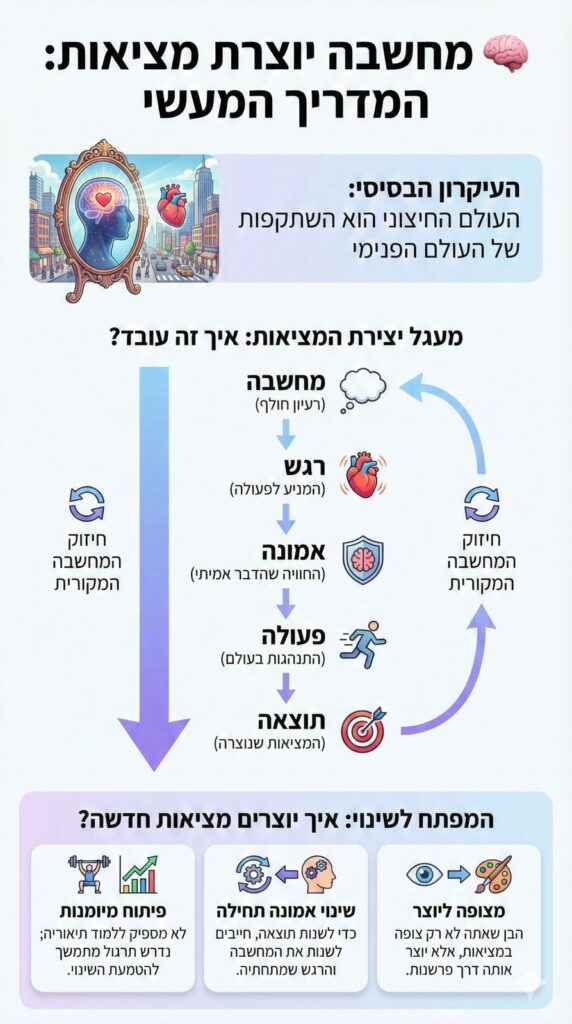 הנה הדיוק החשוב שרוב האנשים מפספסים. כשאנחנו שומעים "מחשבה יוצרת מציאות", אנחנו תמיד חושבים על המציאות החיצונית, הבית, הכסף, הזוגיות. אבל האמת היא שמחשבה קודם כל יוצרת את המציאות הפנימית שלנו, את מה שנקרא "פרשנות".